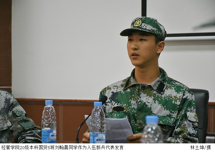 经管学院20级本科国贸5班刘翰晨作为入伍新兵代表发言。他代表beat365官网春季征兵入伍的新兵们向学校领导、老师和父母表示衷心感谢,并保证到部队后将服从命令、努力学习、刻苦训练,争取在服役期间立功,为学校争光,为祖国添彩。