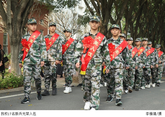 伴随着《中国人民解放军进行曲》歌声的响起,曾荫初部长宣读此次春季入伍新兵名单。参会领导为17名身着戎装的新兵佩戴光荣花和入伍礼仪绶带并合影留念。