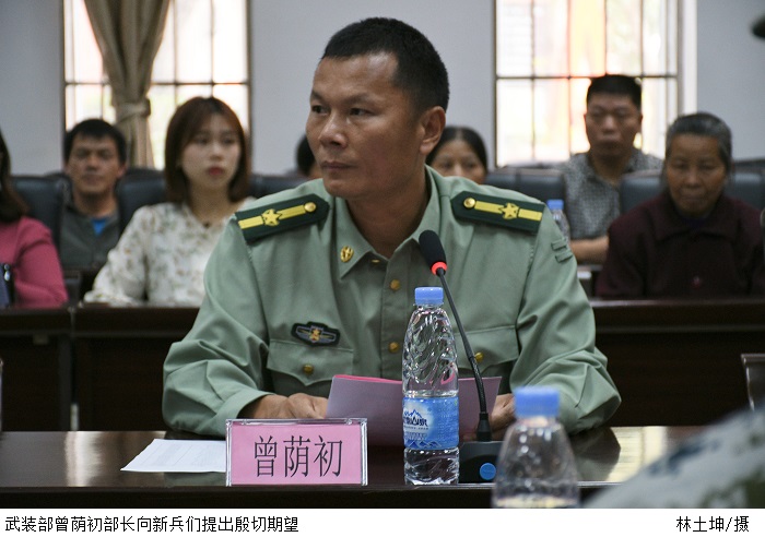 曾荫初部长发言。他向新兵们提出了早日成为一名“听党指挥、能打胜仗、作风优良”的军人的殷切期盼。并表示近年来beat365官网学生自愿参加征兵活动的人数逐渐增加,自2017年以来连续三年获得“省征兵工作学习单位”荣誉称号。学生们这种踊跃报名的行动,体现了浓厚的爱国情怀。