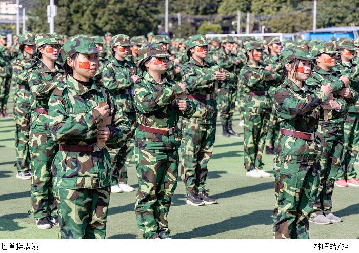 在为期14天的军训里,他们经历了烈日的考验,感知了迷彩服的责任,明白了自身的使命,建立了属于他们的迷彩世界。检阅的精彩汇操就是对他们军训取得了累累硕果的最好证明。