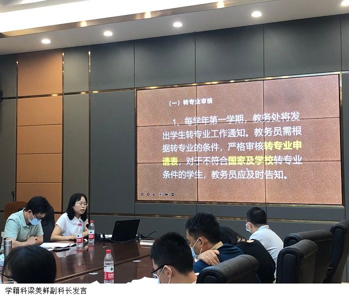 会上,教务科科长张杰、学籍科副科长梁美鲜、考务科副科长庞基展以及实践教学科科长王鹏程分别从人才培养方案、教学执行计划、教学任务、考试成绩、课时统计、学籍异动、毕业审核、教材和试卷、实践教学和毕业论文(设计)管理等常规教学管理工作进行了介绍,并总结了各项教学管理中的要点以及容易出现的问题,提出了相应的解决方案。