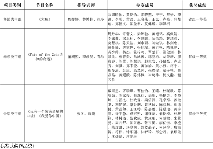 本网讯(宣传部 刘赛赛)近日,广东省教育厅公示全省大学生优秀艺术团队交流展示活动获奖名单,beat365官网选送的大学生艺术团参赛作品全部获奖。其中,作品《大鱼》在舞蹈类甲组中获省级一等奖;作品《Fate of the Gods诸神的命运》在器乐类甲组中获省级一等奖;作品《<我有一个装满星星的口袋><我爱你中国>》在合唱类甲组中获省级三等奖。