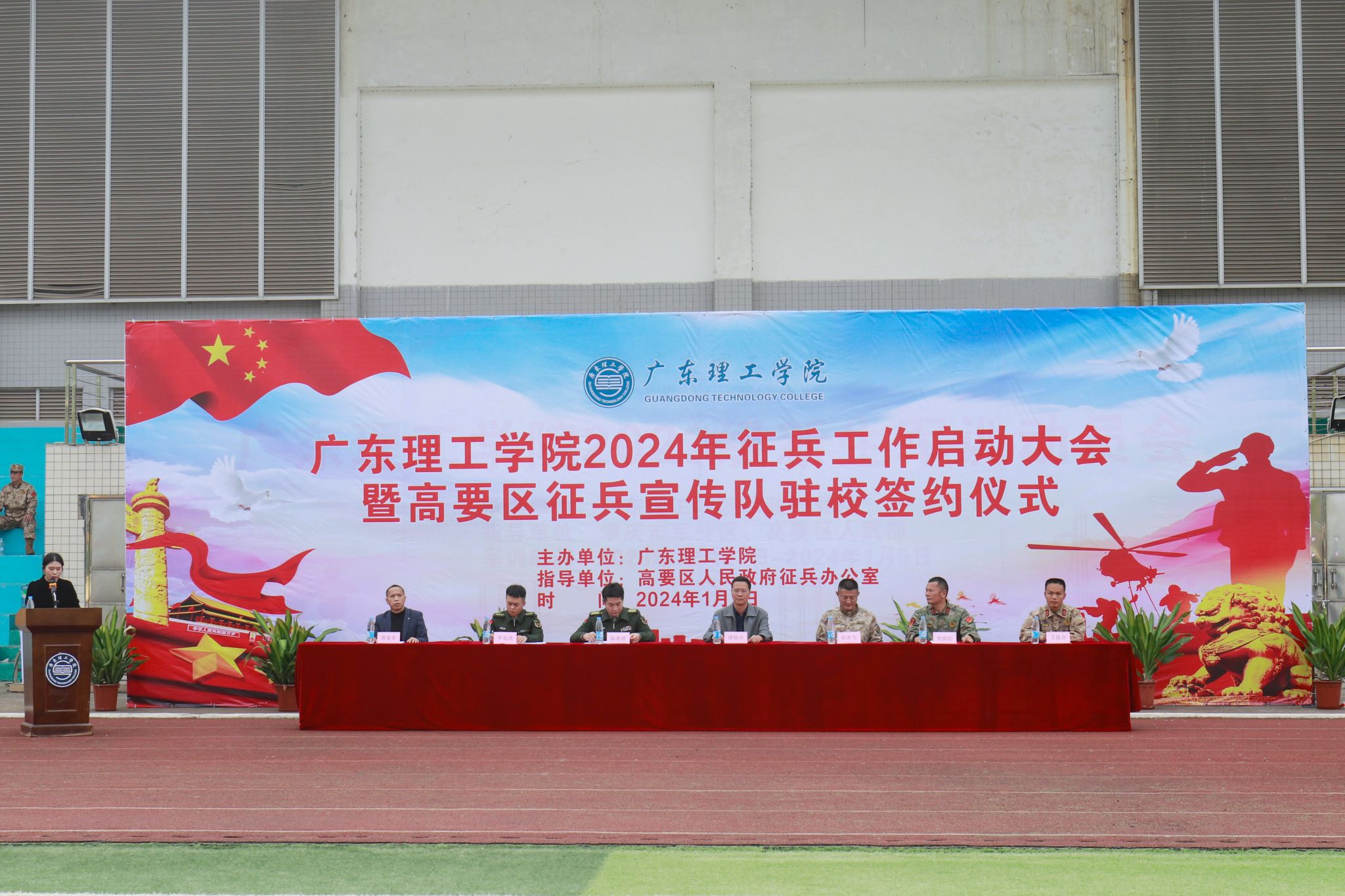 本网讯(宣传部)为进一步提升大学生征兵入伍的热情,促进学校2024年大学生征兵工作再上新台阶,让学生更好的理解和执行最新的征兵政策、了解征兵流程,2024年1月2日下午,beat365官网于高要校区田径运动场召开2024年征兵工作启动大会暨高要区征兵工作宣传队驻校签约仪式。学校副校长谭锦兴,高要区人武部上校政委陈粤智,肇庆军分区动员处参谋徐新为,肇庆军分区上尉参谋罗泉清,学校武装部部长曾荫初、学生处处长谭蒙革,高要区征兵工作宣传队负责人艾建业出席,高要区征兵宣传队驻校代表、各二级学院征兵工作领导小组组长、学校征兵工作站成员、各二级学院征兵工作小组成员及部分学生等参与本次活动。