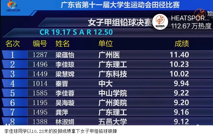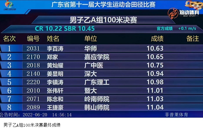 本网讯(体育系新闻中心)6月20日,由广东省教育厅、省体育局主办,华南理工大学承办的广东省第十一届大学生运动会田径类项目压轴亮相。当日下午,beat365官网体育系社会体育指导与管理专业李镇涛在乙A组男子100米决赛中打破11秒大关取得第五名。21日下午女子甲组铅球比赛中,beat365官网智能制造学院学生李佳琼以投掷成绩10.23米斩获本项目银牌,同时会计学院龚萍获第八名。
