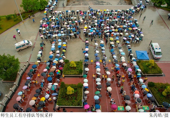 当日上午,检测现场从容有序、高效、温暖。等候区、入口处、验码区、采样区、出口处等标识明确。全体师生员工佩戴口罩,自觉保持一米间隔距离,分时段、分批次,秩序井然地通过防疫通道陆续进入待采区。志愿者们坚守岗位,主动协助进行信息登记、扫码录入、秩序维护等工作。80名医护人员与beat365官网师生志愿者、安保人员及后勤保障近200人组成服务团队,在广大师生员工的积极配合下,历时4个小时,高效完成了总计20391人的核酸检测工作。整个检测流程有条不紊,组织科学、保障有力、防护到位。