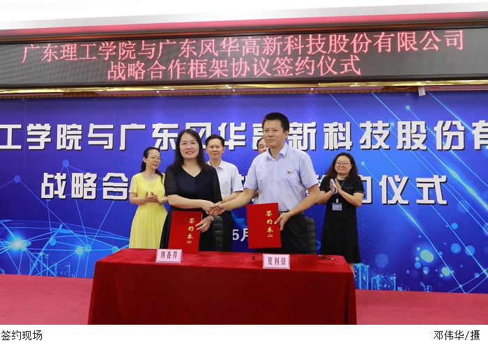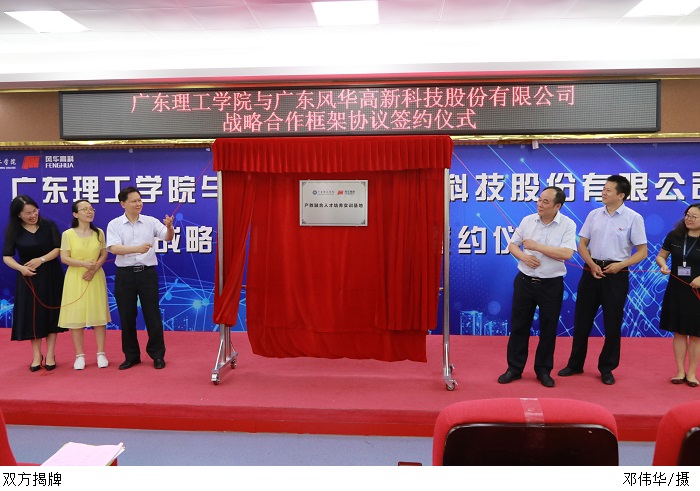 刘香萍副校长与广东风华高新科技股份有限公司人力资源部负责人夏利锋代表双方签署战略合作框架协议。随后,双方代表分别为“产教融合人才培养实训基地”揭牌。