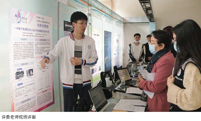 开幕式结束后,各团队参观了“挑战杯”大学生学术科技作品展。本次展览设置了多个专区,全面展现了广理学子在科创方面的丰富成果和勇攀科学高峰的精神。在封闭评审中, 参赛学生在有限的时间内,通过现场讲述及演示,向专家们介绍自己的作品。评委从项目的创新性、可行性,理论和现实意义,以及论证方法等方面对作品作出评价,并就项目的完善和改进作出指导。
