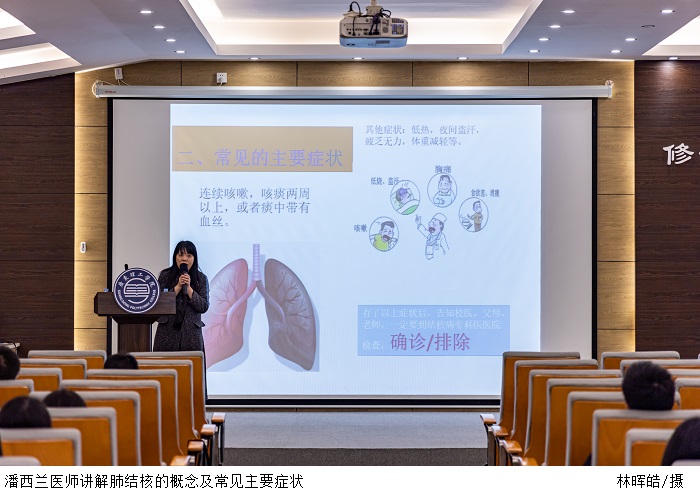 本次讲座主要围绕肺结核的发展、如何预防肺结核及肺结核在校园易发的因素三个方面展开。黄小华医师简要讲述了关于肺结核的发展阶段、传播途径、肺结核诊断过程以及化学治疗方案。随后,潘西兰医师对肺结核的概念及常见主要症状进行了详细讲解,旨在希望同学们可以重视每一个可能危及自身健康的疾病及时就医。谈及如何预防肺结核,她表示,加强学生对肺结核防治知识的了解与提高针对可疑症状的敏感性是预防的关键。校园易发肺结核因素来源于学生压力大、户外活动少、缺乏防治知识、不及时就医、聚集易传染。她提倡同学们在日常生活中要注重个人卫生及饮食、强身体魄,增强自身免疫力,养成良好习惯并号召同学们要保护好自身安全,共同预防肺结核建设一个和谐校园。
