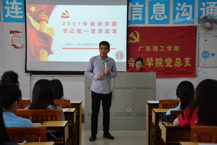本网讯(会计学院)为使会计学院师生养成良好的思想品德和正确的行为习惯,树立更好的社会责任感并提高自身素质,引导干部们做好新学期规划,了解会计学院本学期教学计划和目标,提升自己的执行力,3月16日下午,会计学院黎伯毅书记思政第一课在高要校区7211教室如期举行。学生党支部郭凤玮书记以及全体师生代表参加讲座。