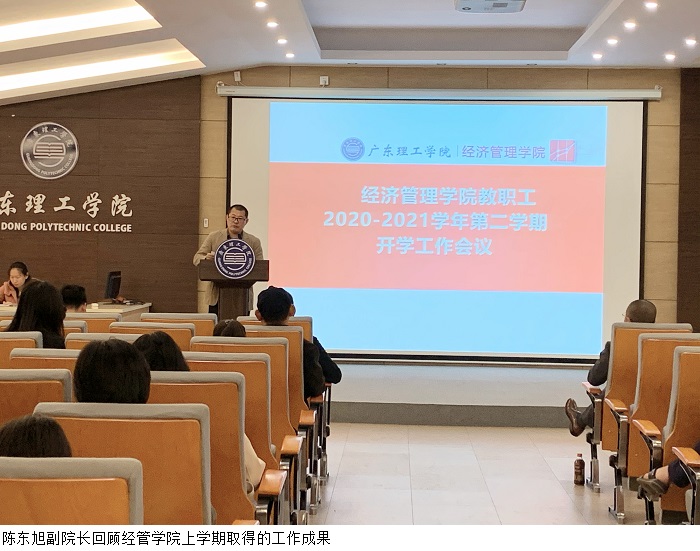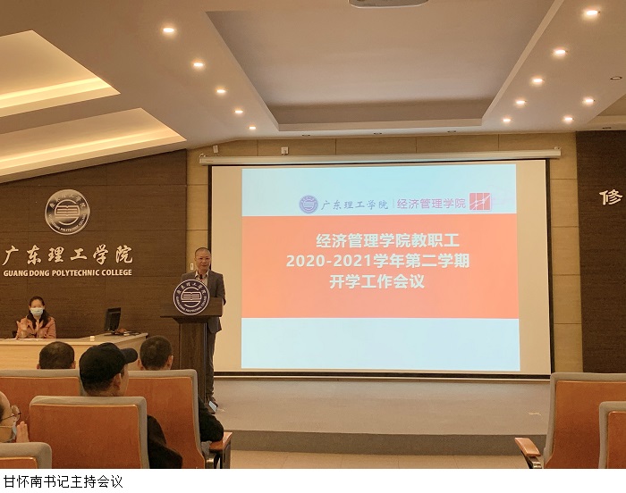 本网讯(经济管理学院)3月1日上午,经济管理学院教职工2020-2021学年第二学期开学工作会议在beat365官网鼎湖校区行政楼三楼学术报告厅召开。本次会议由党总支甘怀南书记主持,季六祥院长、魏嫚副院长、陈东旭副院长、党总支吴楚升副书记、办公室李佳妍主任出席会议,我院全体教职工参会。