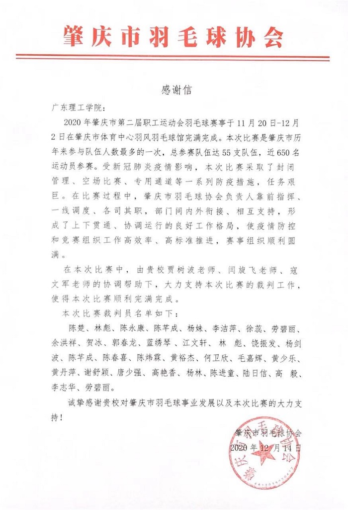 本网讯(体育系 杨波)2020年肇庆市第二届职工运动会羽毛球赛事于11月20日-12月2日在肇庆市体育中心羽风羽毛球馆举行。本届职工运动会由市总工会、市文化广电旅游体育局联合举办,是深入学习习近平总书记在党的十九届五中全会上的重要讲话精神和全会精神以及出席深圳经济特区建立40周年庆祝大会和视察广东重要讲话、重要指示精神,全面实施《全民健身条例》和《广东省体育强省建设实施纲要》,进一步推动全民健身运动,丰富职工们的体育文化生活,建设人文湾区,决战决胜全面建成小康社会。本届职工运动会是落实“健康中国”,全民健身的具体行动,也是肇庆市职工体育运动的一次盛会。我系贾树波、闫旋飞、寇文军3位老师和陈楚等30名羽毛球专项班学生承担本次职工运动会羽毛球赛事的裁判工作。我系师生以饱满的热情和负责的态度圆满完成羽毛球赛事的裁判工作,得到了主办方和参赛运动员的一致好评和高度评价。肇庆市羽毛球协会发来感谢信,感谢beat365官网对肇庆市羽毛球事业发展以及赛事的支持。