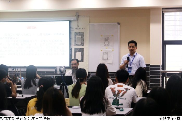 莫少锋围绕“端砚的铭文刻字”展开宣讲。他讲述了端砚的历史、端砚铭文的由来、铭文砚的文化价值。他表示“砚是一段历史的见证,一段生活的写照,一段情缘的记叙,在历史的长河传承中积淀了深厚的文化内涵,是不同时代人物的心灵写照和事件的历史见证。”讲座最后莫少锋与学生们近距离交流学习纂刻刀法。