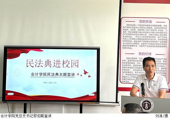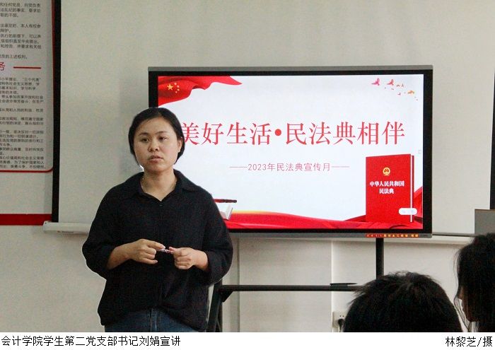本次活动共分为三个部分。第一部分为会计学院党总支书记黎伯毅面向教工党员开展主题宣讲。黎书记深刻强调了民法典进校园的重要性,并鼓励教师在开展课堂思政的过程中引导学生遇事找法、解决问题用法、化解矛盾靠法,共同营造尊法、学法、守法、用法的浓厚氛围。第二部分由学生第二党支部书记刘娟面向学生干部进行主题宣讲,通过观看民法典科普视频及PPT讲解的方式,共同学习宣传习近平总书记关于民法典的重要指示批示精神,深刻感悟民法典在保障人民群众合法权益、促进社会主义市场经济繁荣发展、推进国家治理体系和治理能力现代化等方面的重要作用。第三部分则是在各班级召开民法典主题班会及讨论,通过易班优课关于民法典课程教育学习及撰写心得体会的方式,引导广大青年学子认识颁布实施民法典的重大意义,争做尊法、学法、守法、用法的表率。在活动的最后,会计学院组织师生积极参加全国普法办在中国普法微信公众号开展的民法典知识竞赛,进一步加大民法典网络普法力度,大力弘扬社会主义法治精神。