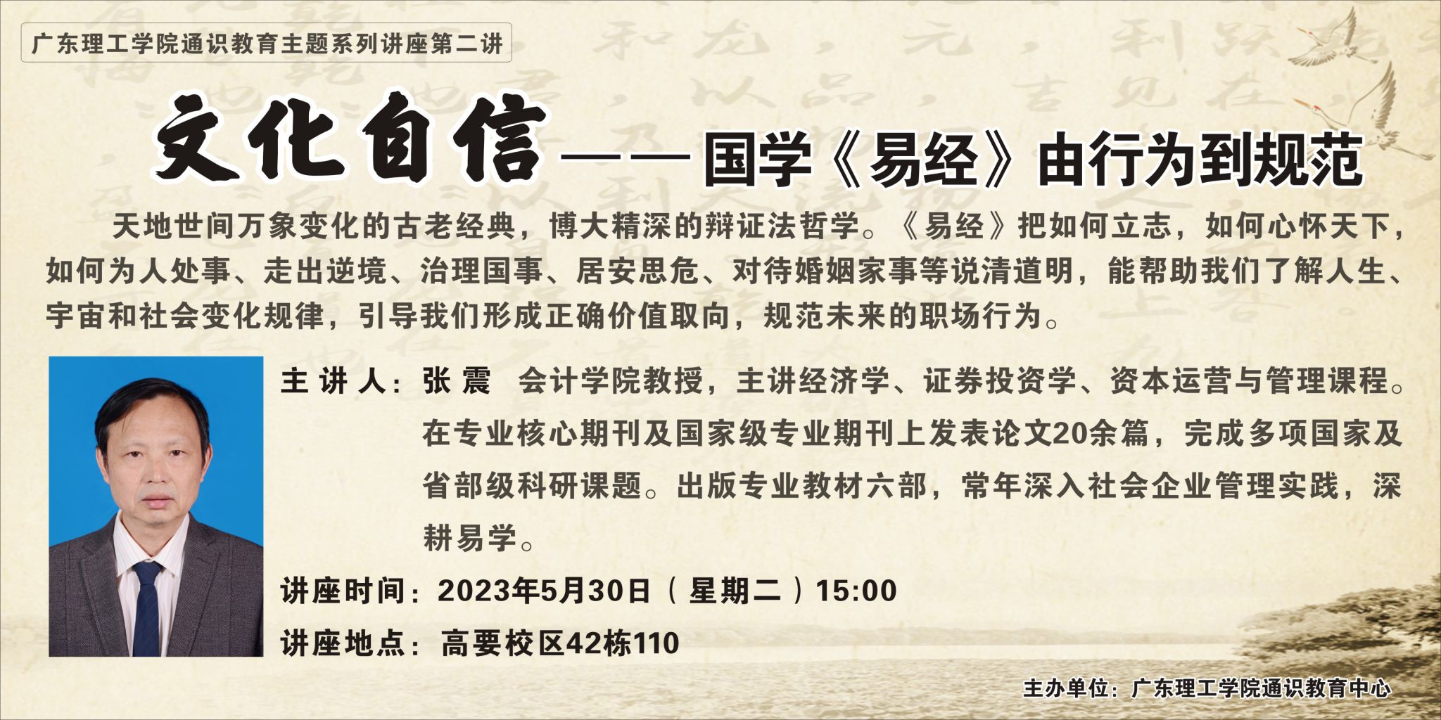 本网讯(通识教育中心 但志慧)为培养学生的哲学思辨能力、滋养优秀国学底蕴和掌握明辨是非能力,通识教育中心于2023年5月30日举办了以“文化自信——国学《易经》由行为到规范”为主题的讲座。讲座由通识教育中心主任金妤主持,会计学院张震教授主讲,全校共300余师生参加本次讲座。