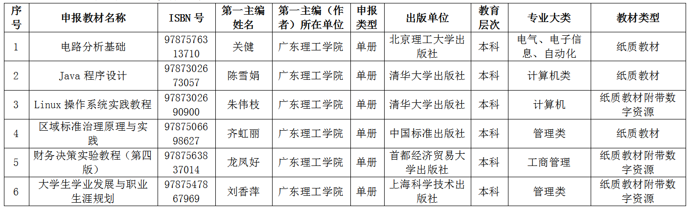 根据《广东省教育厅转发国家教材委员会关于开展第二届全国教材建设奖评选工作的通知》安排,学校组织了出版教材的校内遴选工作,经个人申报、教学单位推荐、专家组评审等程序,拟推荐《电路分析基础》、《Java程序设计》及《Linux操作系统实践教程》等6本教材参加第二届全国教材建设奖遴选。