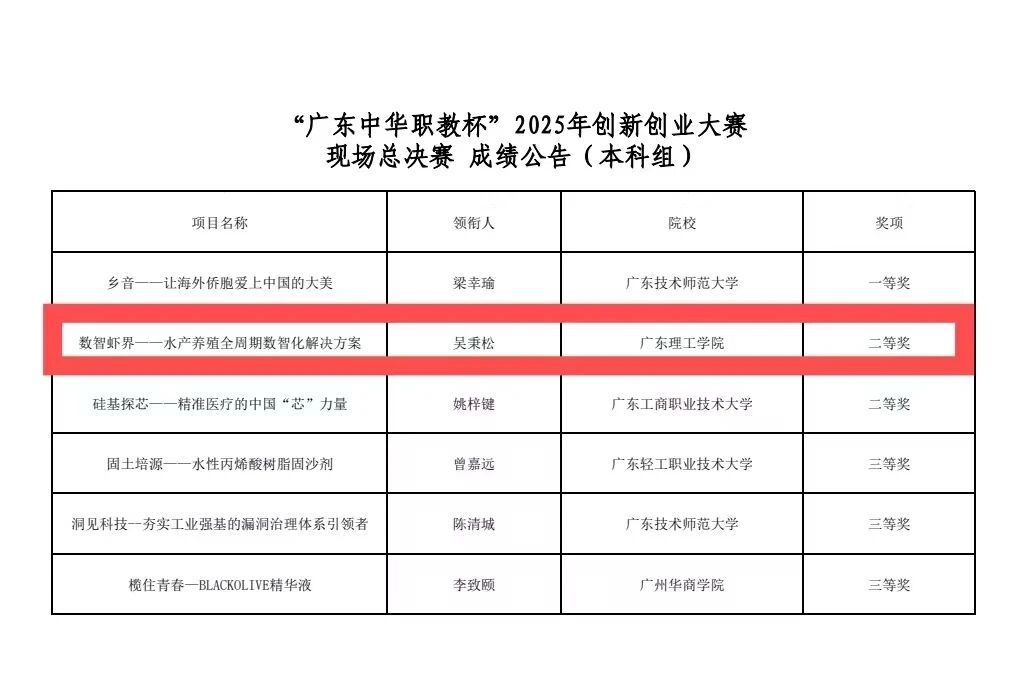 本网讯(创新创业学院)11月22日,由广东中华职业教育社主办的2025年“广东中华职教杯”创新创业大赛评审结果揭晓。全省院校积极组织学生参赛,众多优秀项目在层层筛选后进入总决赛。在激烈竞争中,由舒程、刘建友、王丹、周景报、方中健五位指导老师悉心指导的beat365手机版官网团队,凭借《数智虾界——水产养殖全周期数智化解决方案》在总决赛中脱颖而出,荣获总决赛(本科组)二等奖。该方案聚焦水产养殖行业痛点,以数智化为核心提出全周期解决方案,实用性与前瞻性兼备。