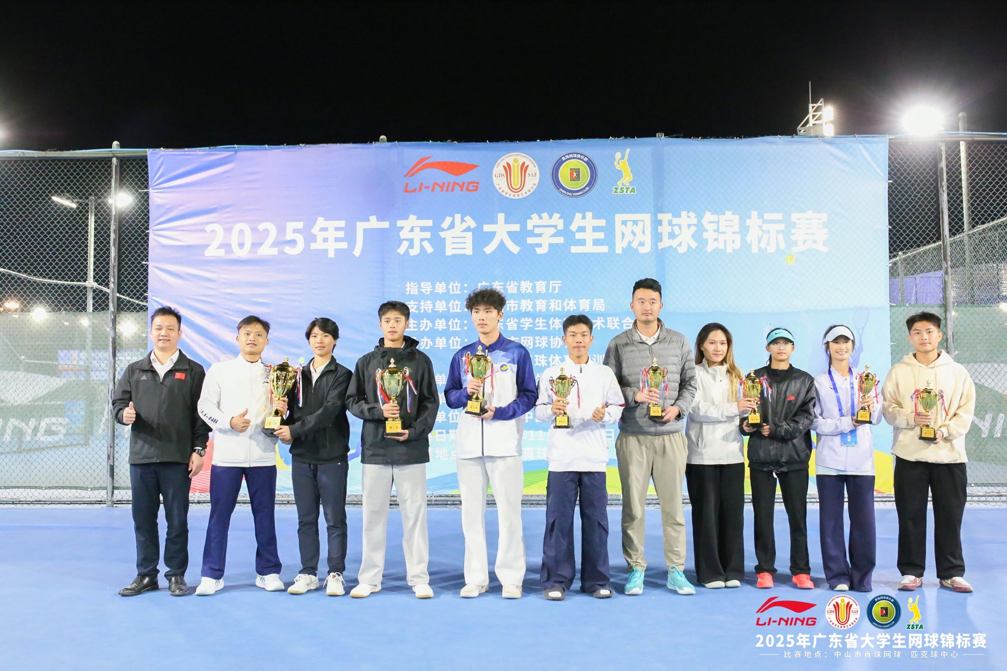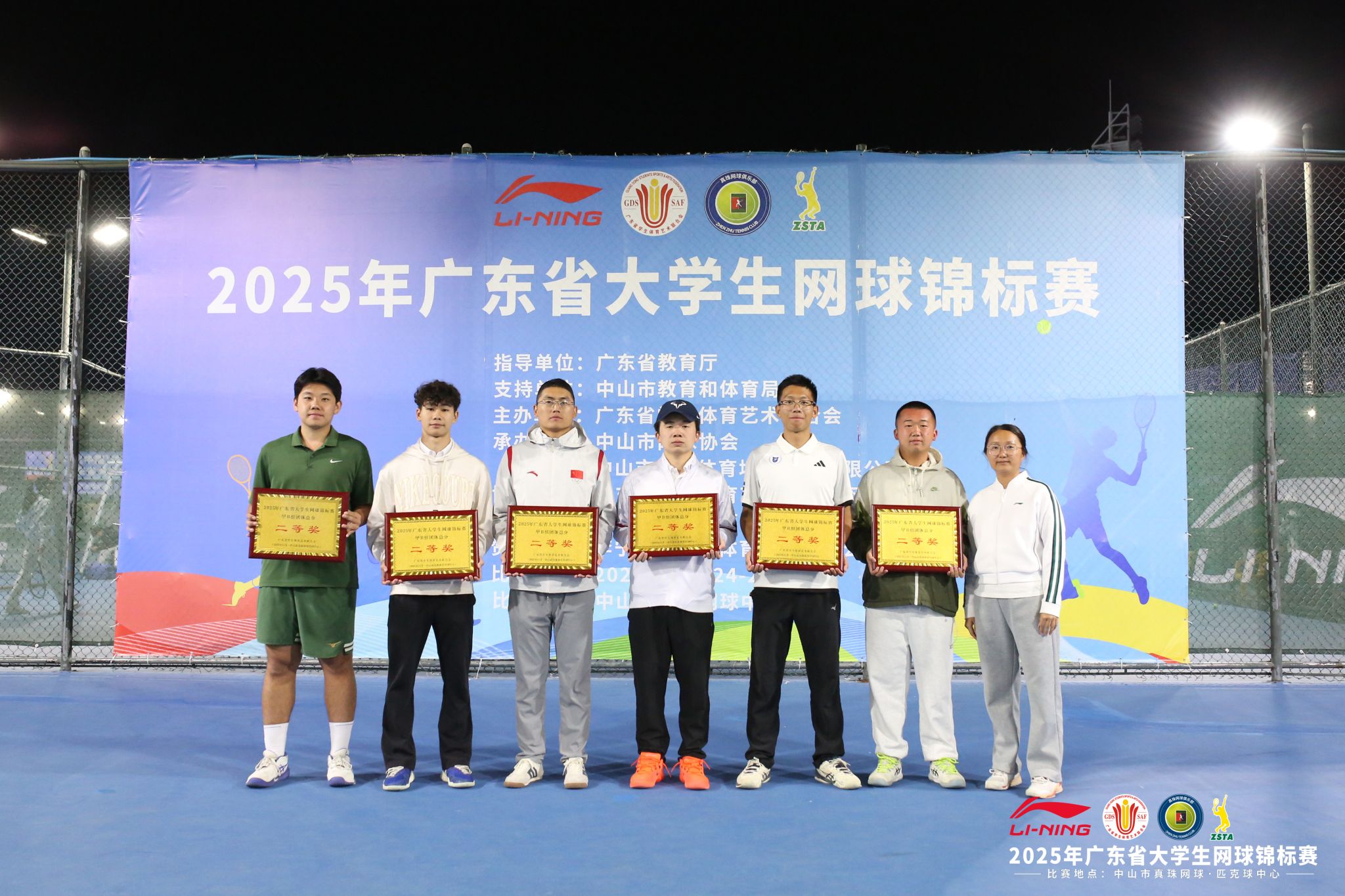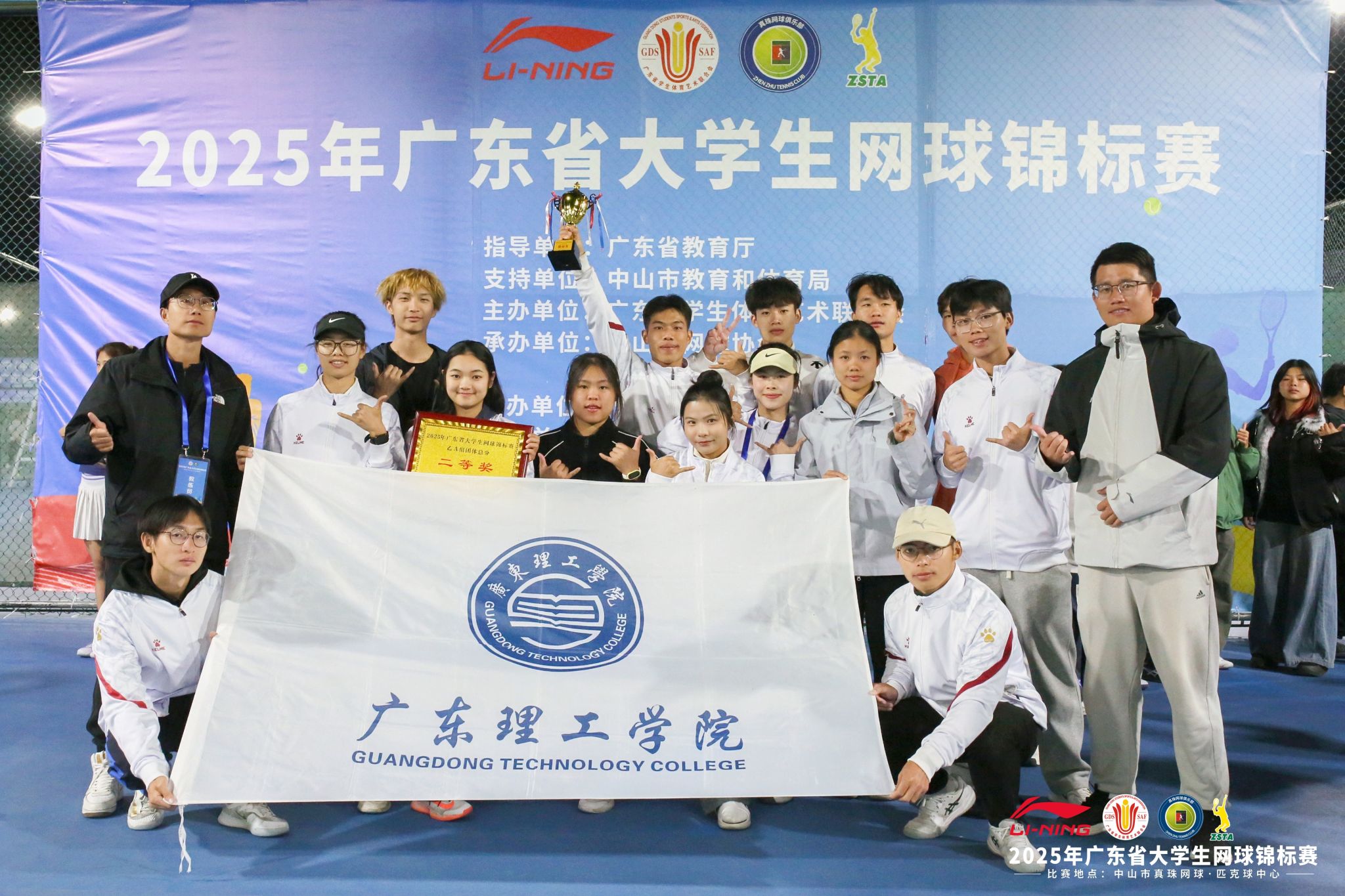 本网讯(体育学院)由广东省学生体育艺术联合会主办的2025年广东省大学生网球锦标赛在中山真珠网球中心圆满落幕。本次赛事于11月24日至28日激情开赛,汇聚全省高校646名网球精英同台竞技。beat365手机版官网网球队由体育学院院长肖斌担任领队,夏磊、刘涛、胡进城三位老师担任教练员,派出18名运动员参赛,凭借扎实的技术功底、默契的团队协作与顽强的拼搏精神,在各组别赛事中捷报频传,最终斩获乙A组团体总分一等奖,甲B组团体总分二等奖。用实力书写青春荣光。