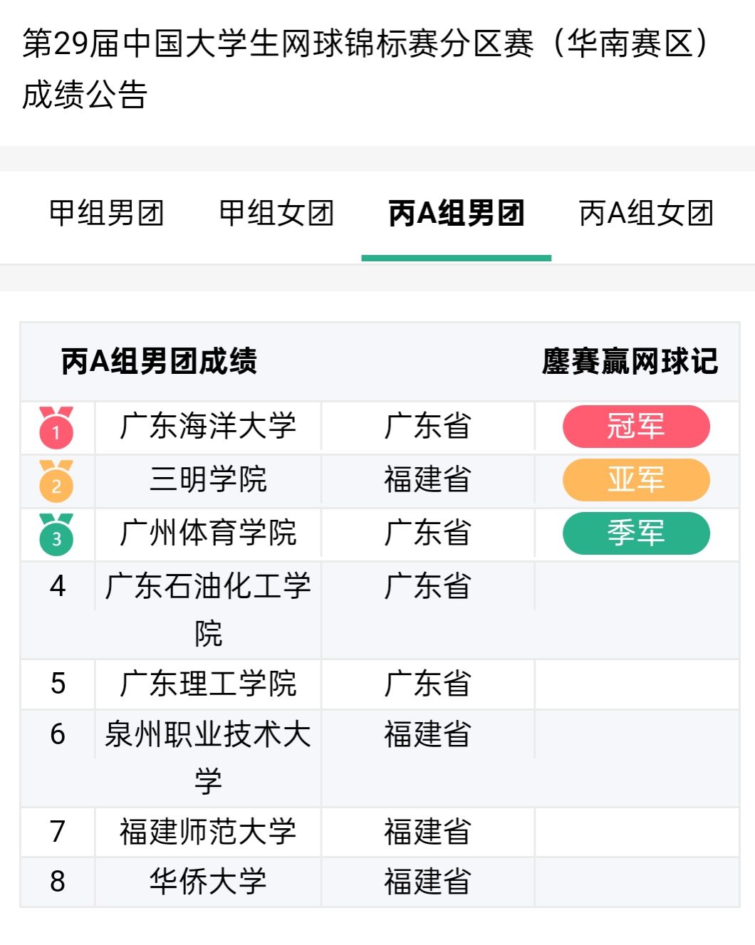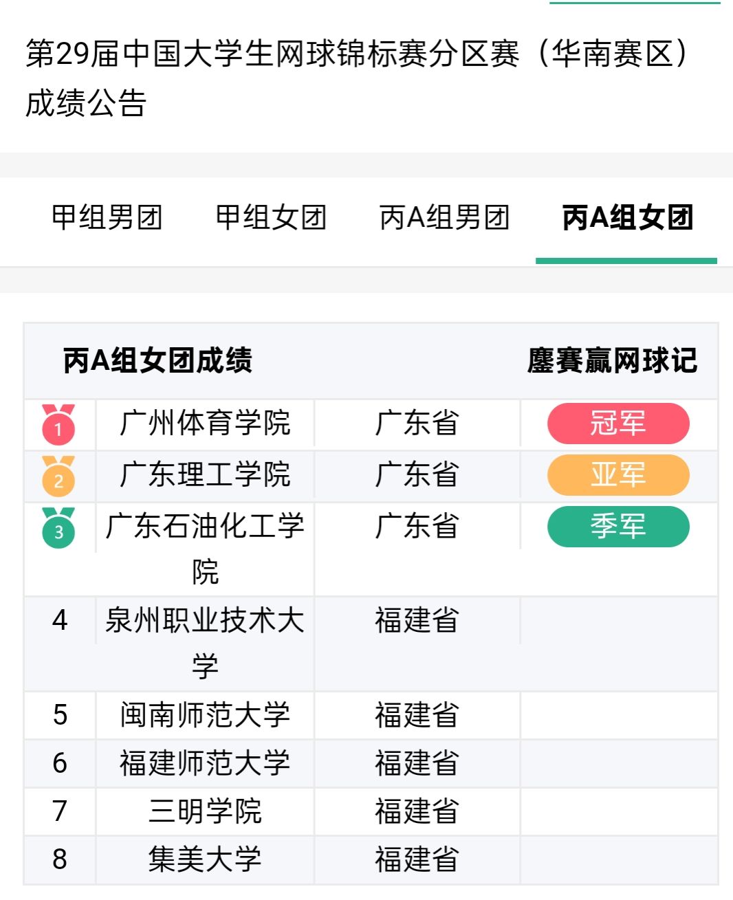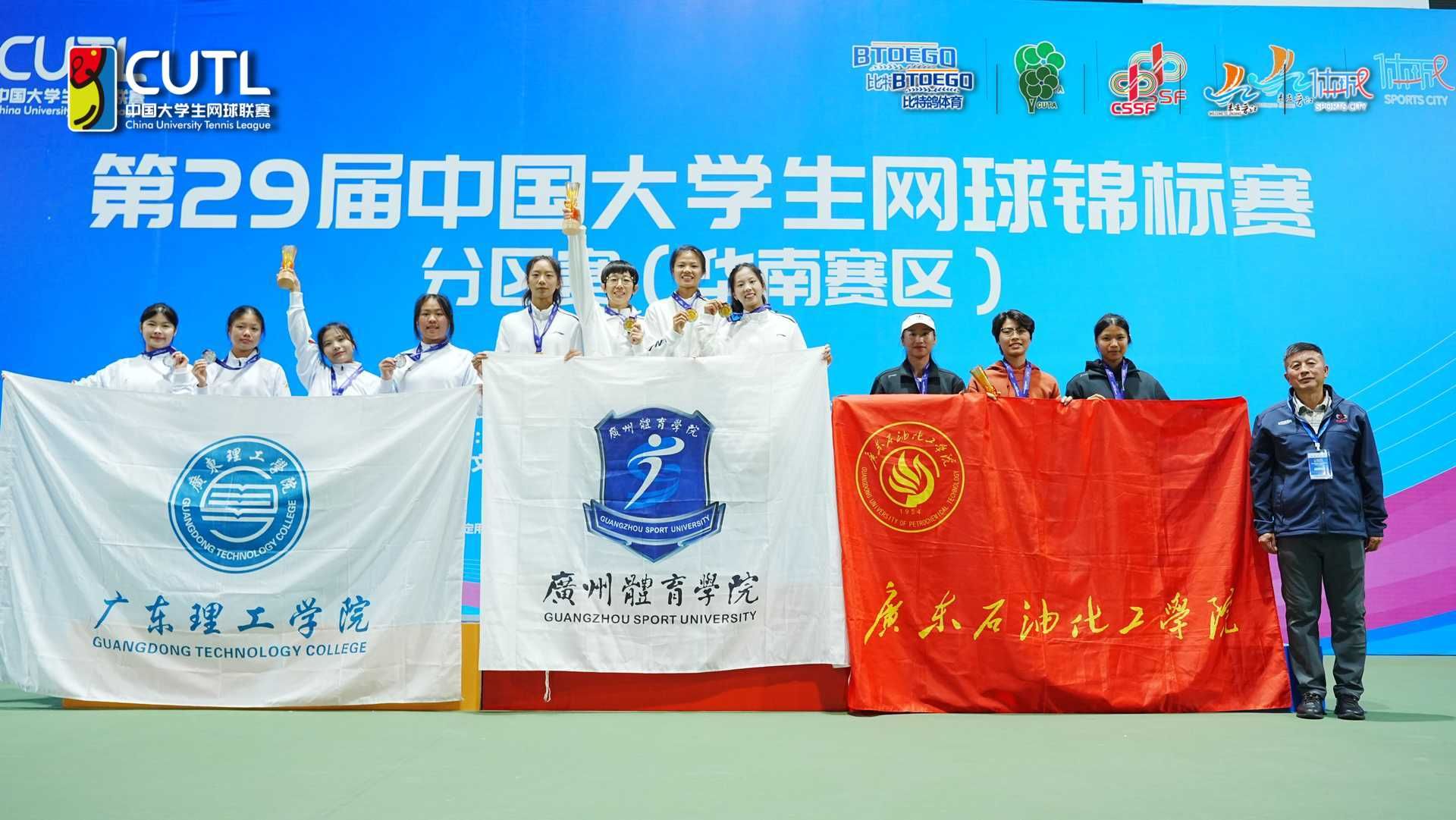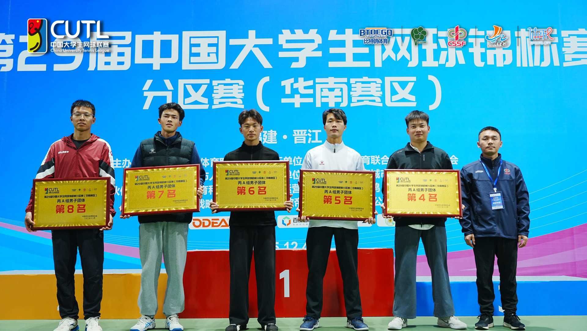 本网讯(体育学院)12月6日,由中国学术体育联合会主办的第29届中国大学生网球锦标赛(华南赛区)在福建省晋江市全民健身中心网球馆圆满落幕。beat365官网网球队在体育学院党委书记苏庚华的带领下,由夏磊、刘涛、胡进城三位教师担任教练,12名参赛学子奋勇拼搏,最终斩获丙A组女子团体亚军、丙A组男子团体第五名、丙A组团体一等奖的优异成绩,创下beat365官网网球队团体赛事历史最佳战绩。