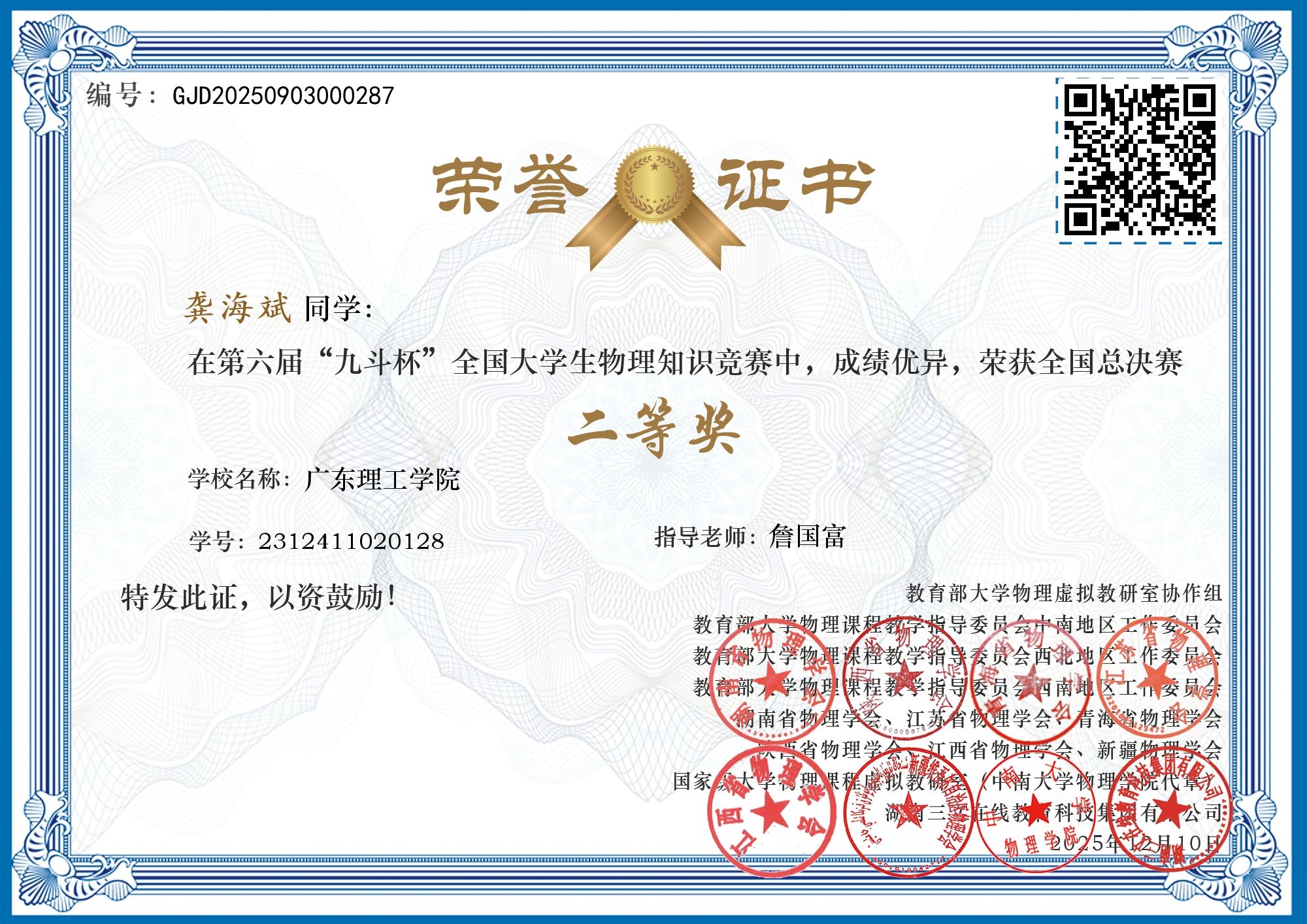 2 | 龚海斌 | 23本科机电1班 | 物理类专业 | 全国二等奖 | 詹国富 |