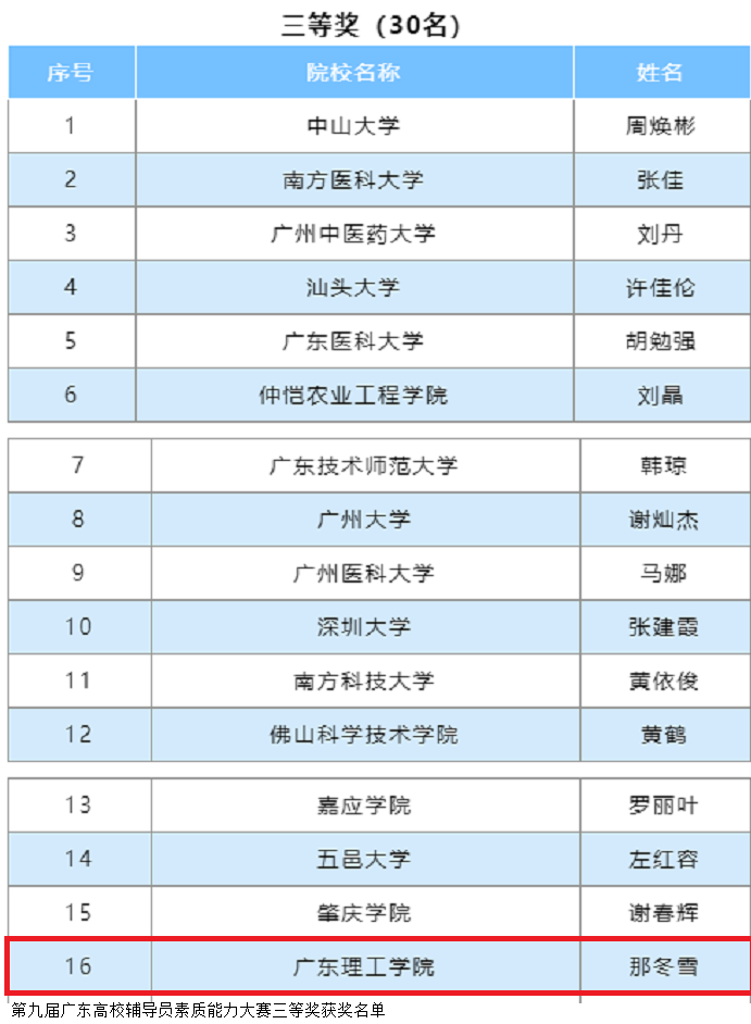 本网讯(宣传部 杨丽莎)近日,第九届广东高校辅导员素质能力大赛在珠海科技学院举行。beat365官网辅导员那冬雪沉着应战,发挥稳定,荣获大赛三等奖。 大赛设置基础知识测试、案例研讨和谈心谈话三个环节。在与全省其他高校...